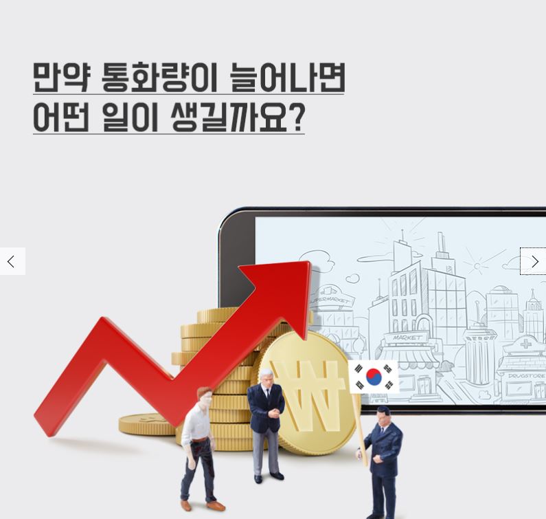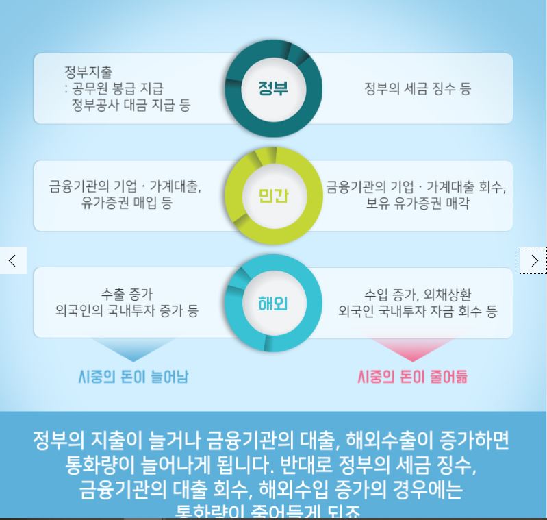 정부의 지출이 늘거나 금융기관의 대출, 해외수출이 증가하면 통화량이 늘어나게 됩니다.