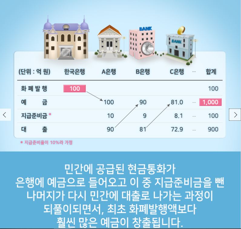 민간에 공급된 현금통화가 은행에 예금으로 들어오고 이 중 지급준비금을 뺀 나머지가 다시 민간에 대출로 나가는 과정이 되풀이 되면서, 최초 화폐 발행액보다 훨씬 많은 예금이 창출됩니다.