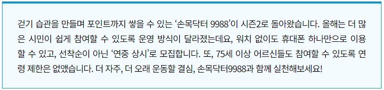 이를 위해 9988 손목닥터 모집에 호응이 좋아 조기 마감된 것을 고려해 올해는 기존의 선착순 모집에서 연중 모집으로 전환합니다.