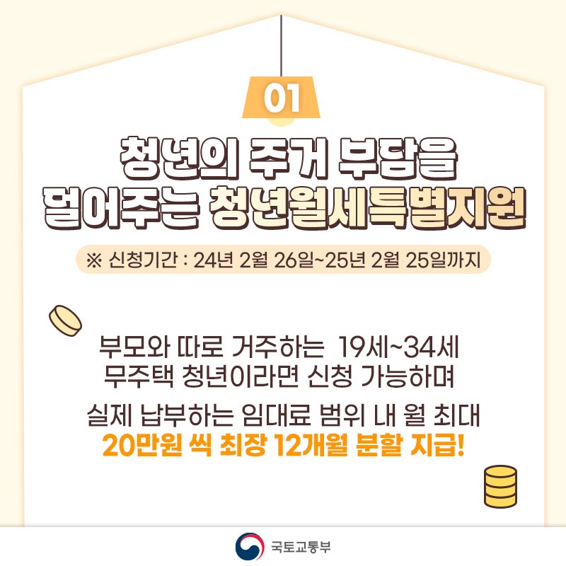 월세로 거주하는 청년을 대상으로 실제 납부하는 임대료를 최대 240만원(월 최대 20만원)까지 최대 12개월(회) 동안 매월 분할하여 지원