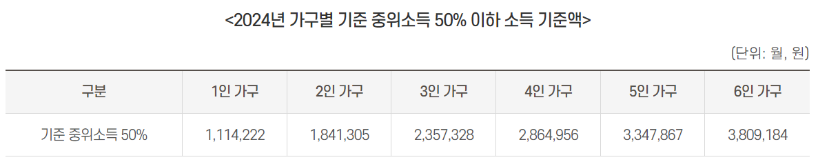 공고일(23.12.27)을 기준으로 가구 소득이 각 가구의 중위소득의 50% 이하이고 자산이 3억 2600만원 이하인 가구입니다.